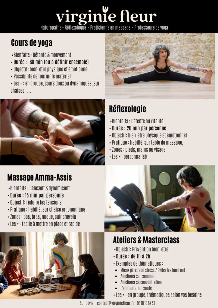 J’organise des événements sur-mesure, dans le cadre de la qualité de vie au travail (QVT). L’occasion de permettre aux équipes de ralentir quelques heures pour bénéficier de soins et de conseils pratiques pour recharger leurs batteries et gérer le stress au quotidien